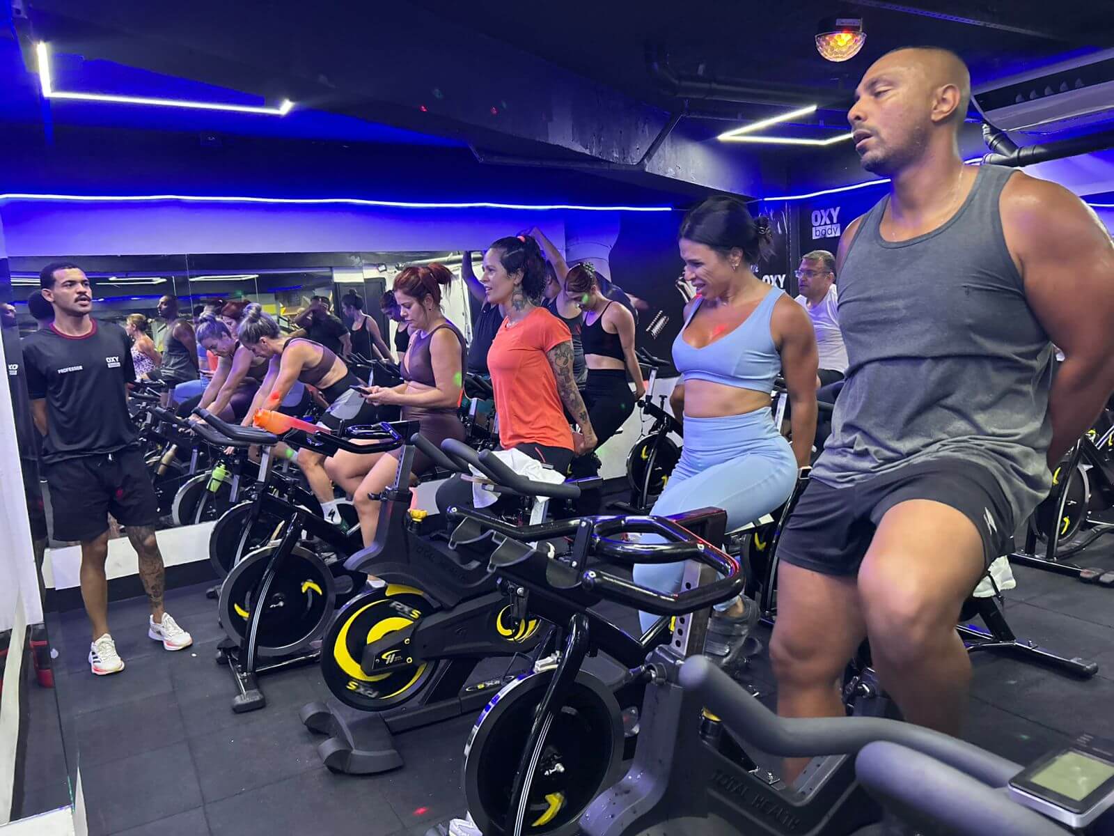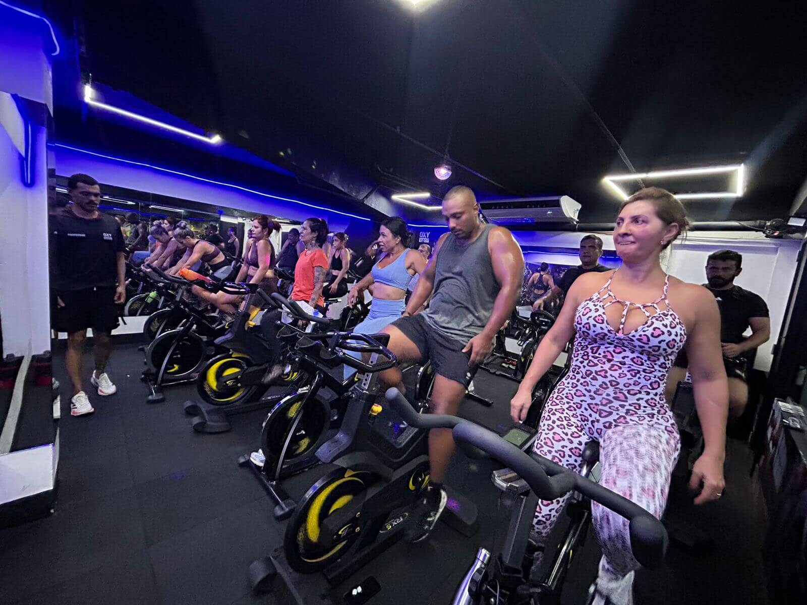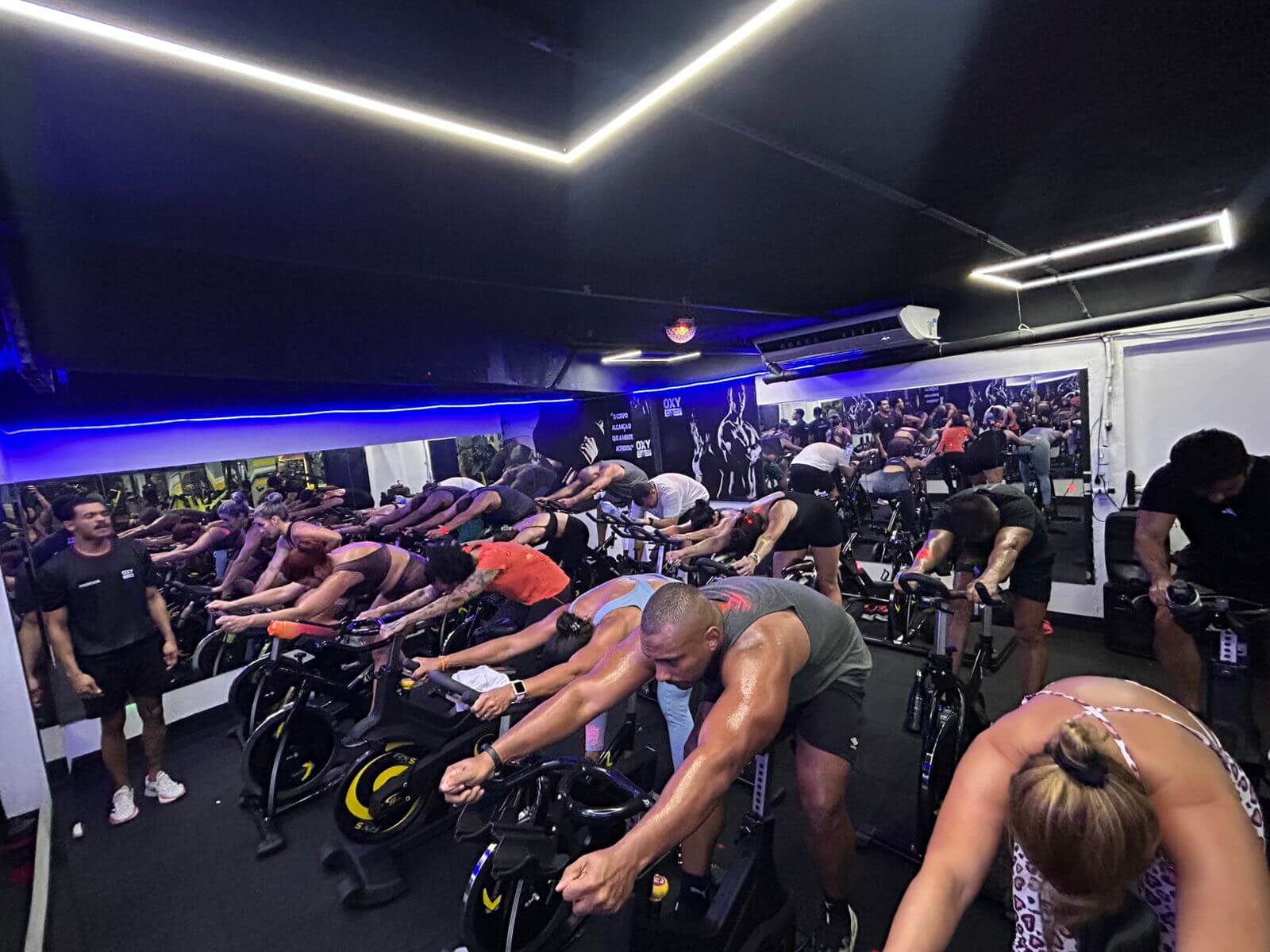 Uma sala para pedalar com climatização, luzes e som, aos cuidados de um professor que simula subidas, descidas etc. Como se você estivesse fazendo ciclismo mas em um ambiente interno com segurança, conforto e animação.